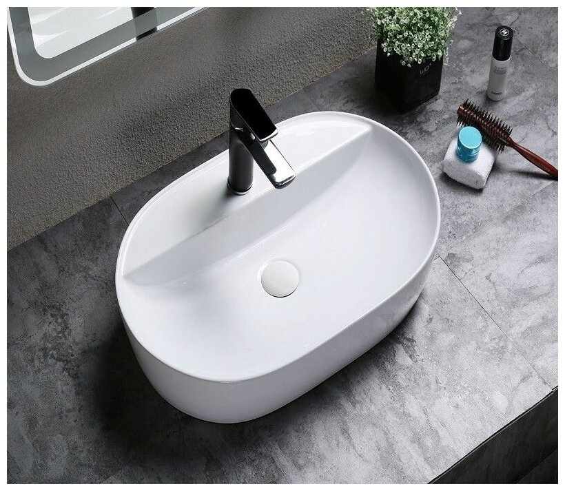 Раковина для ванной, CeramaLux D1346, накладная, овальная, с антигрязевым покрытием, с отверстием под смеситель. Гарантия 10 лет.