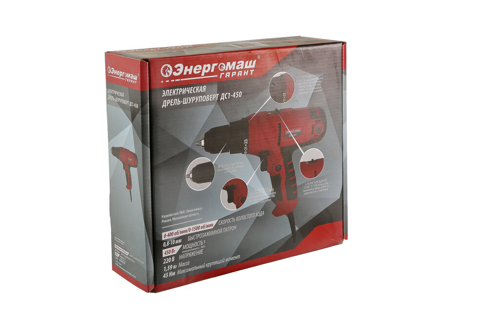Дрель-шуруповерт 450Вт. 2 скор. 0-400/0-1500 об/мин. 45Нм. Быстр/зажимной патрон 10мм. 23+1. SOFTTOUCH. Бита PH2. ДС1-450 Энергомаш Гарант