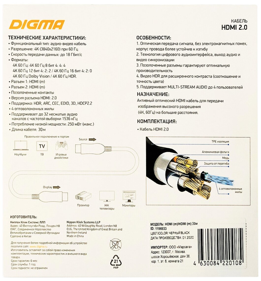 Кабель Digma HDMI 2.0 AOC BHP AOC 2.0-30 HDMI (m)/HDMI (m), ver 2.0, 30м.
