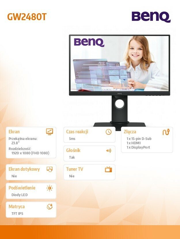 Монитор BENQ 23,8" GW2480T IPS LED 1920x1080 5ms 16:9 250 cd/m2 3000:1 12M:1 178/178 D-sub HDMI DP Flicker-free HAS Pivot Tilt Swivel Speaker Black ( 9H.LHWLA.TPE,дисплей ЖК, LCD, Full HD , VGA )