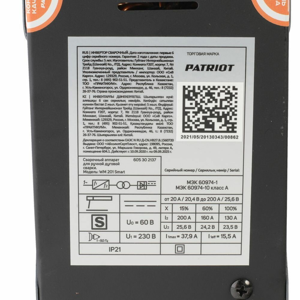 Аппарат сварочный PATRIOT WM 201 Smart /MMA /200 А/ 8,3 кВт/ ПВ 60%/ работа от 140 В