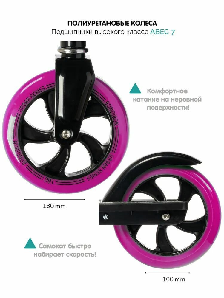 Самокат детский BONDIBON DELTA сталь+пластик, складной, колеса PU 160160мм, розовый