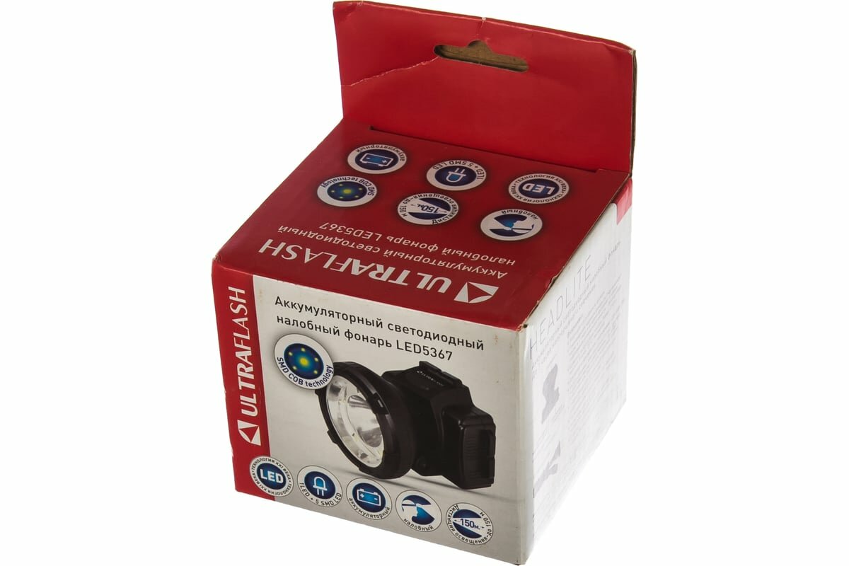 Фонарь налобн аккум 220в, черный, 1,2 втт led+5smd, 2 реж, пласт, бокс ultraflash led5367