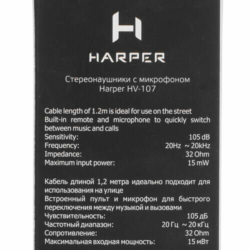 HARPER HV-107 white {Чувствительность: 105dB±3dB; Сопротивление: 32?; Частотный диапазон: 20-20000Hz; Длина кабеля: 1.2m}