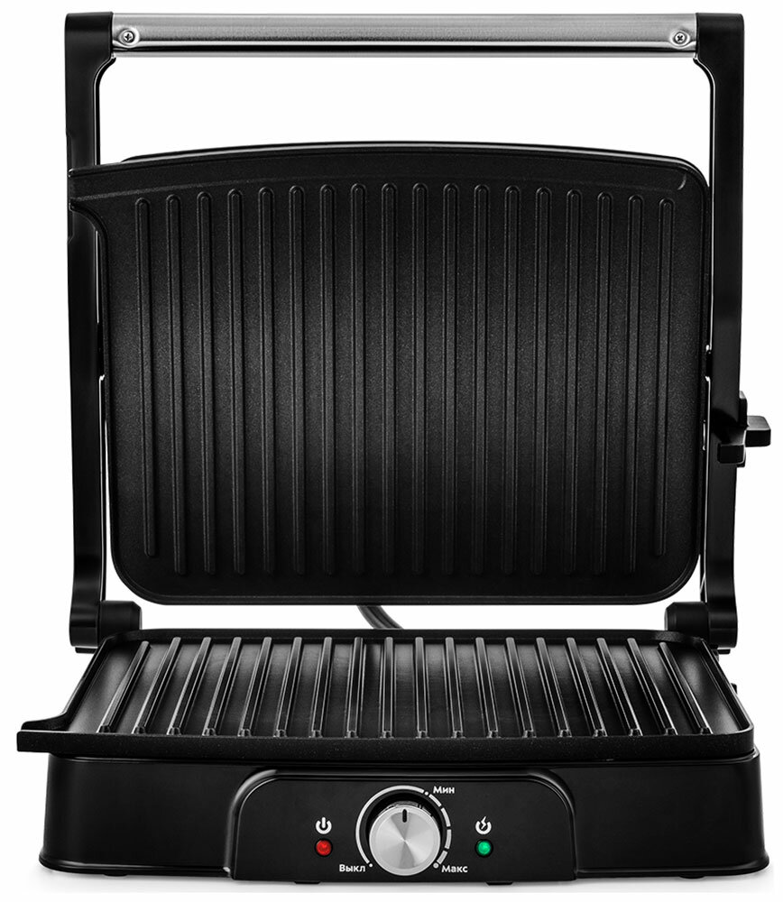 | Плюсы: | Быстрый нагрев, оптимальный размер панелей, простое управление, прекрасная прожарка мяса и овощей, раскладывающиеся на 180 градусов панели |