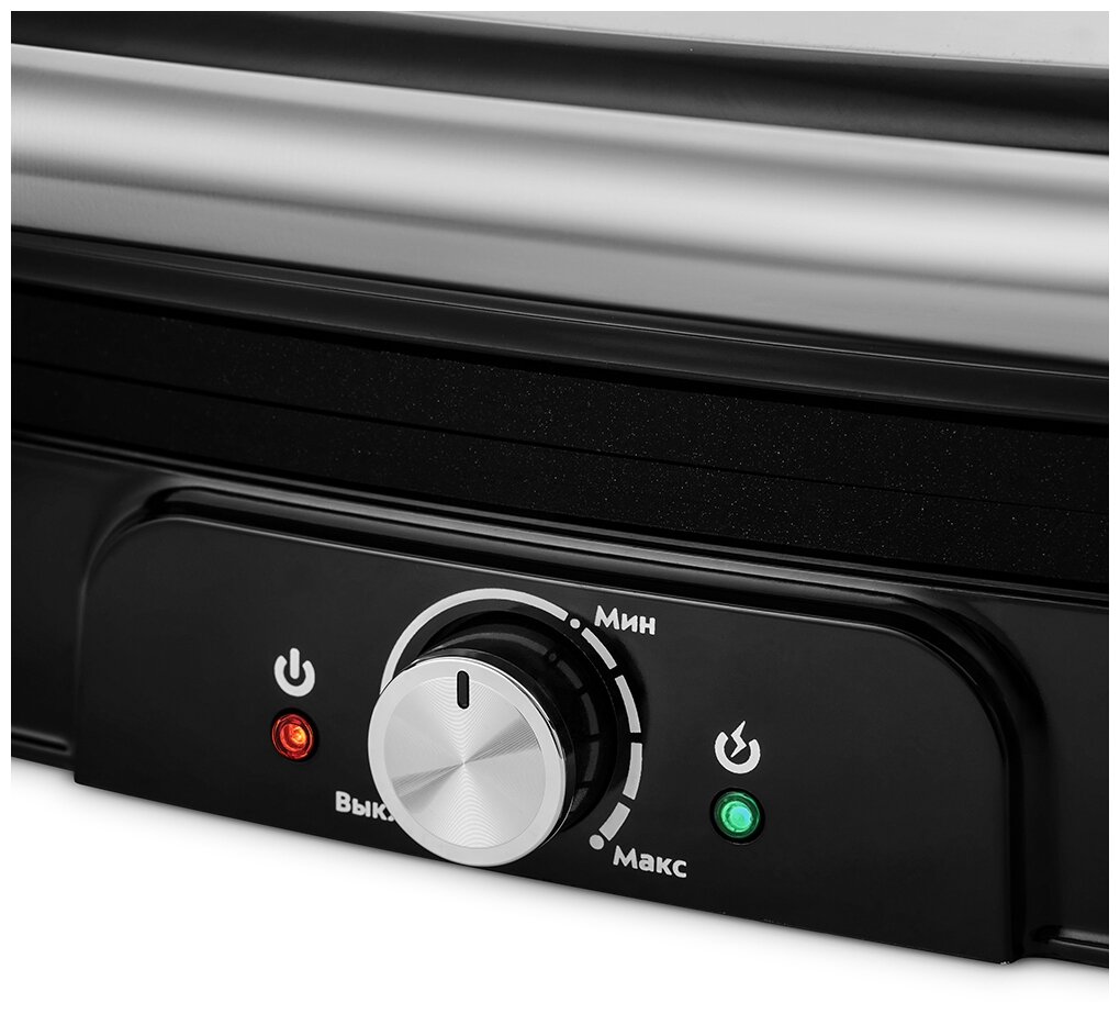 | Плюсы: | Быстрый нагрев, оптимальный размер панелей, простое управление, прекрасная прожарка мяса и овощей, раскладывающиеся на 180 градусов панели |
