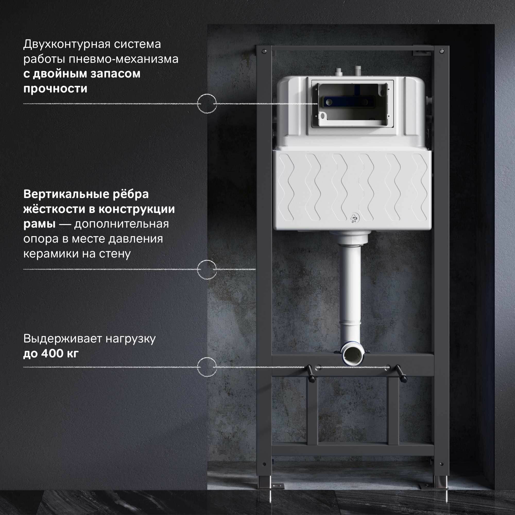 | Дополнительная информация | кнопка в комплект не входит; стальной профиль 40*40 мм толщиной 2 мм; нагрузка до 400 кг; бесшовный бачок из полиэтилена с защитой от конденсации |
