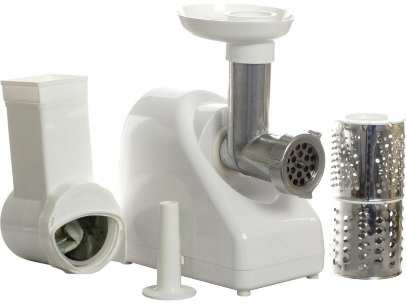 | Плюсы: | недорогой агрегат, металлический корпус, реверс, много насадок, легко моется, подходят нож и решетка от ручной мясорубки, быстро мелет и замороженное, приемлемый шум |