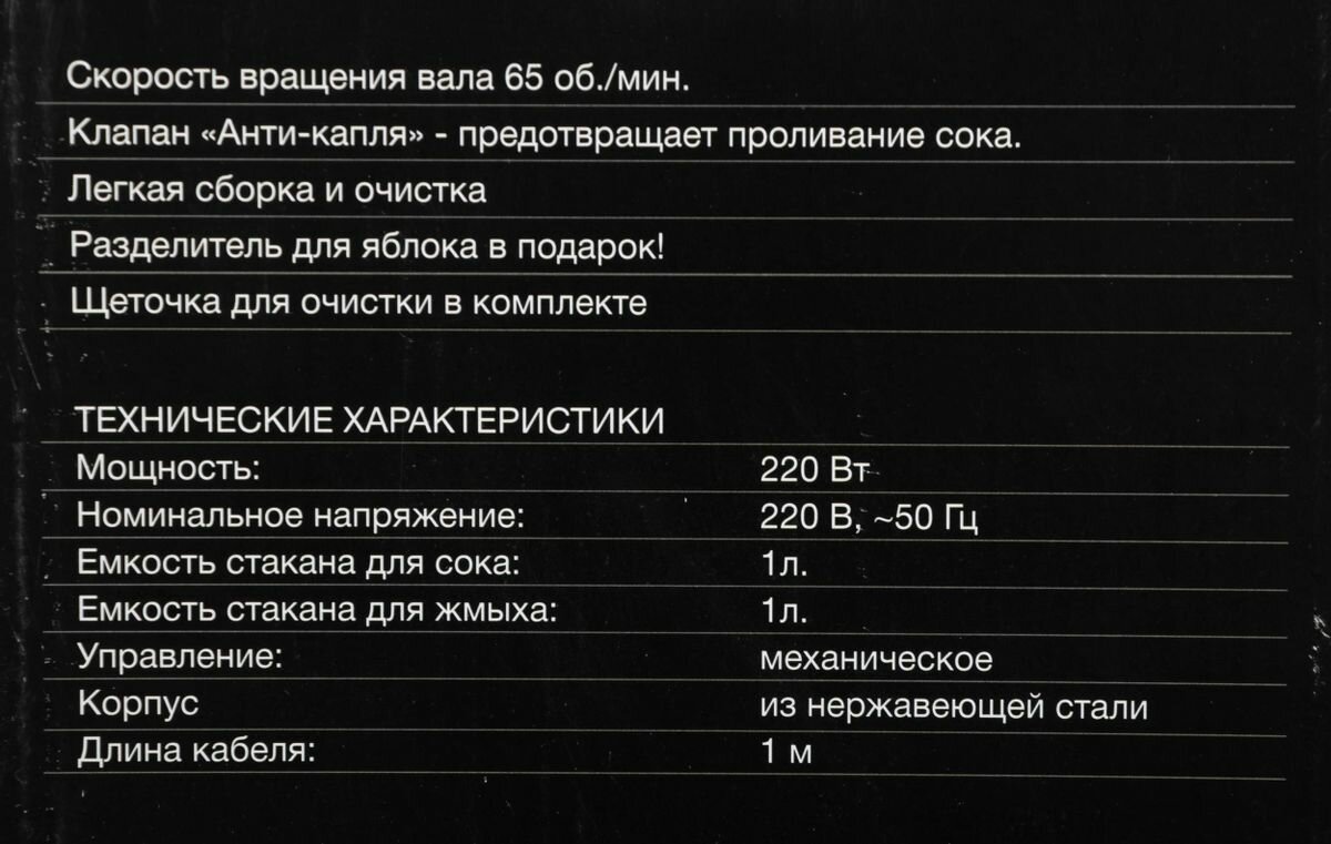 | Отзыв: | Резервуар на 1 литр для сока, мощность на 220 вт как вся техника у меня |