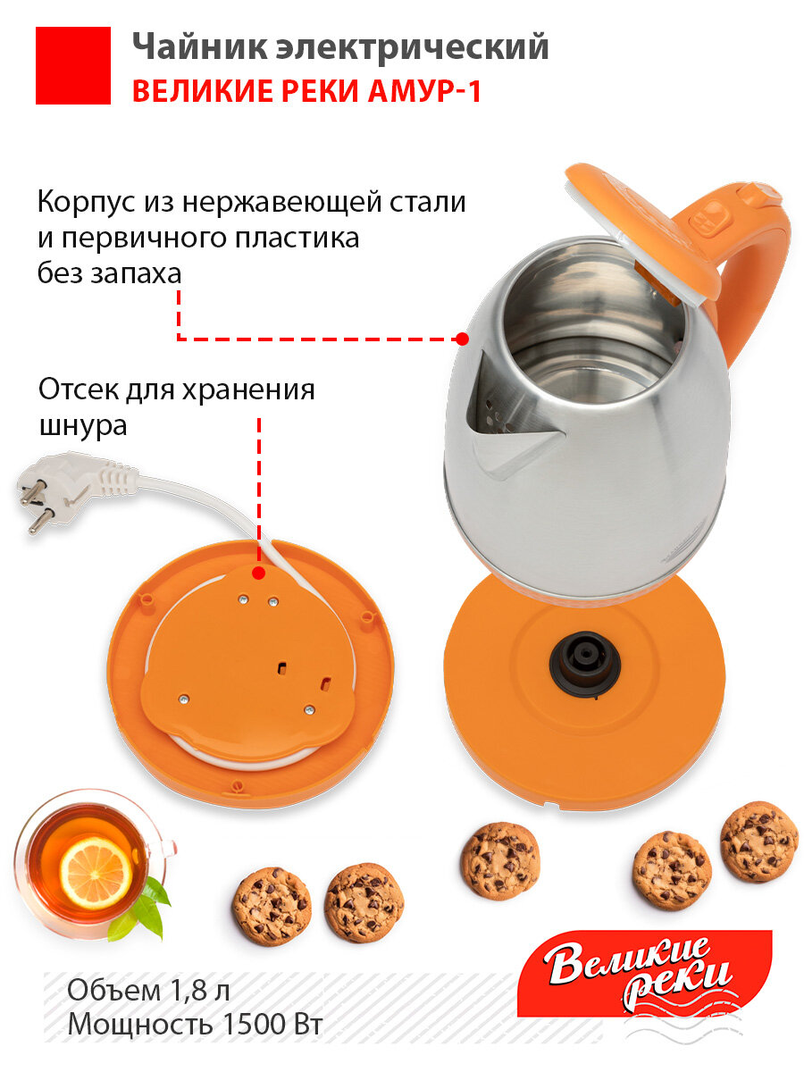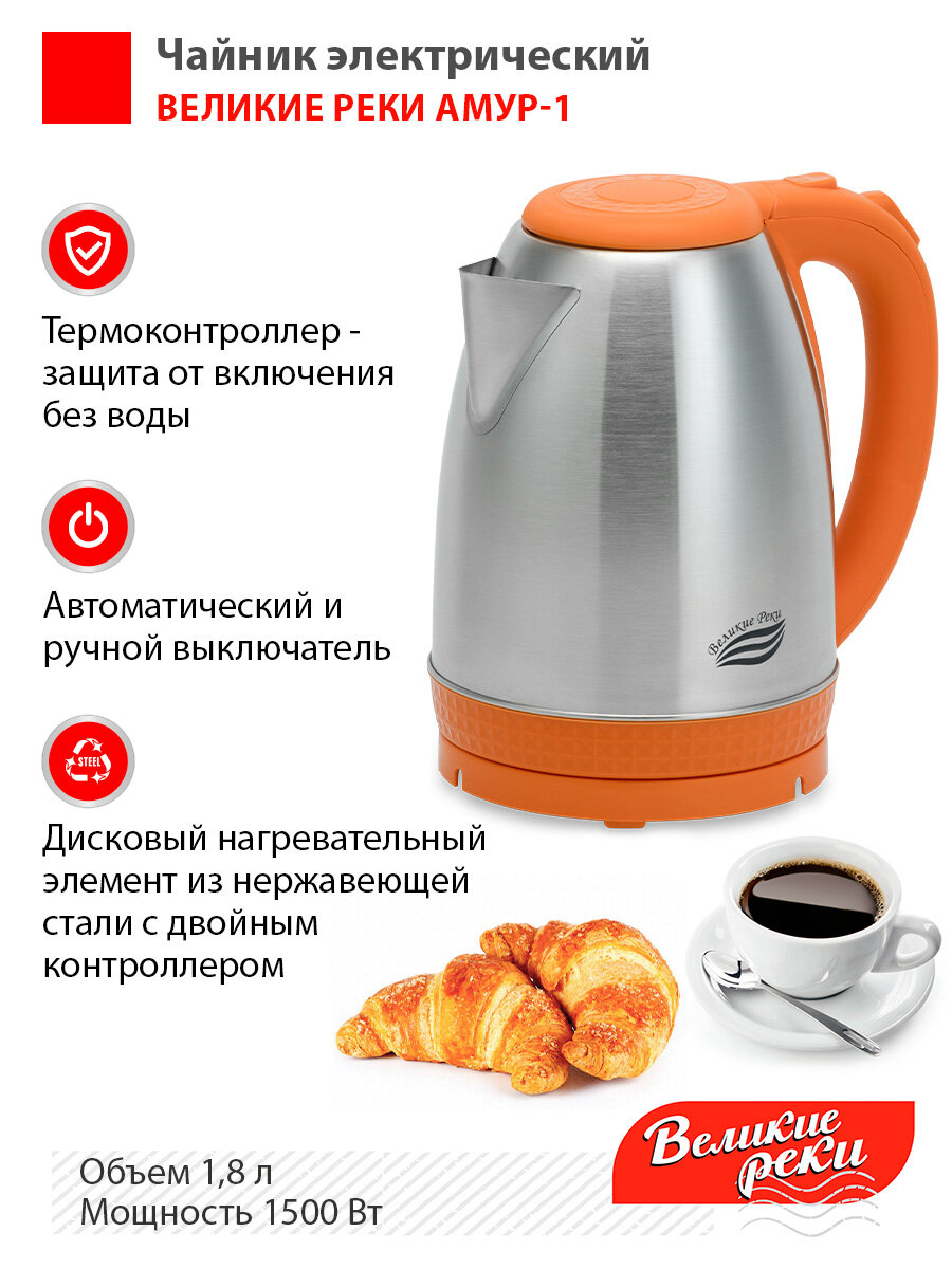 Купить Чайник электрический Великие реки Амур-1 оранжевый, 1,8л, нержавейка