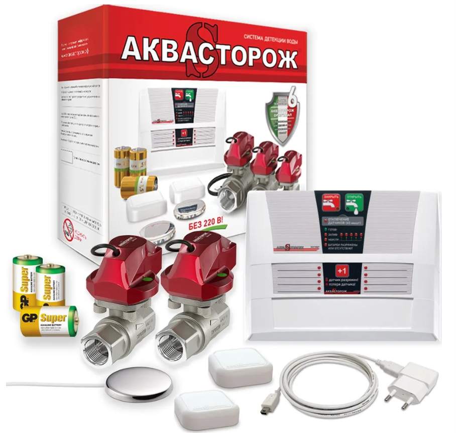 | Подробная комплектация | - 2 крана 1/2" RuB (BONOMI, Италия) (ДУ 15мм), - Контроллер Эксперт+ - Радиобаза + 2 беспроводных датчика - 2 проводных датчика Эксперт АК50 (провода 2 м, 4м) - Батареи LR14 (тип «C») 3 шт, крепеж, - Блок питания 5В «Robiton» |