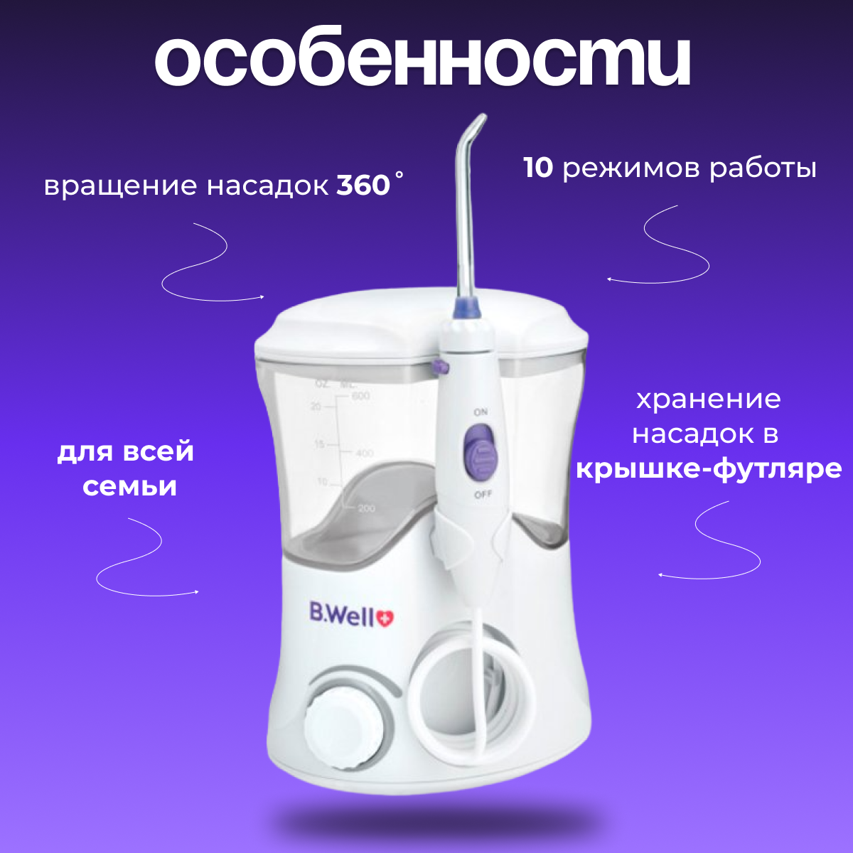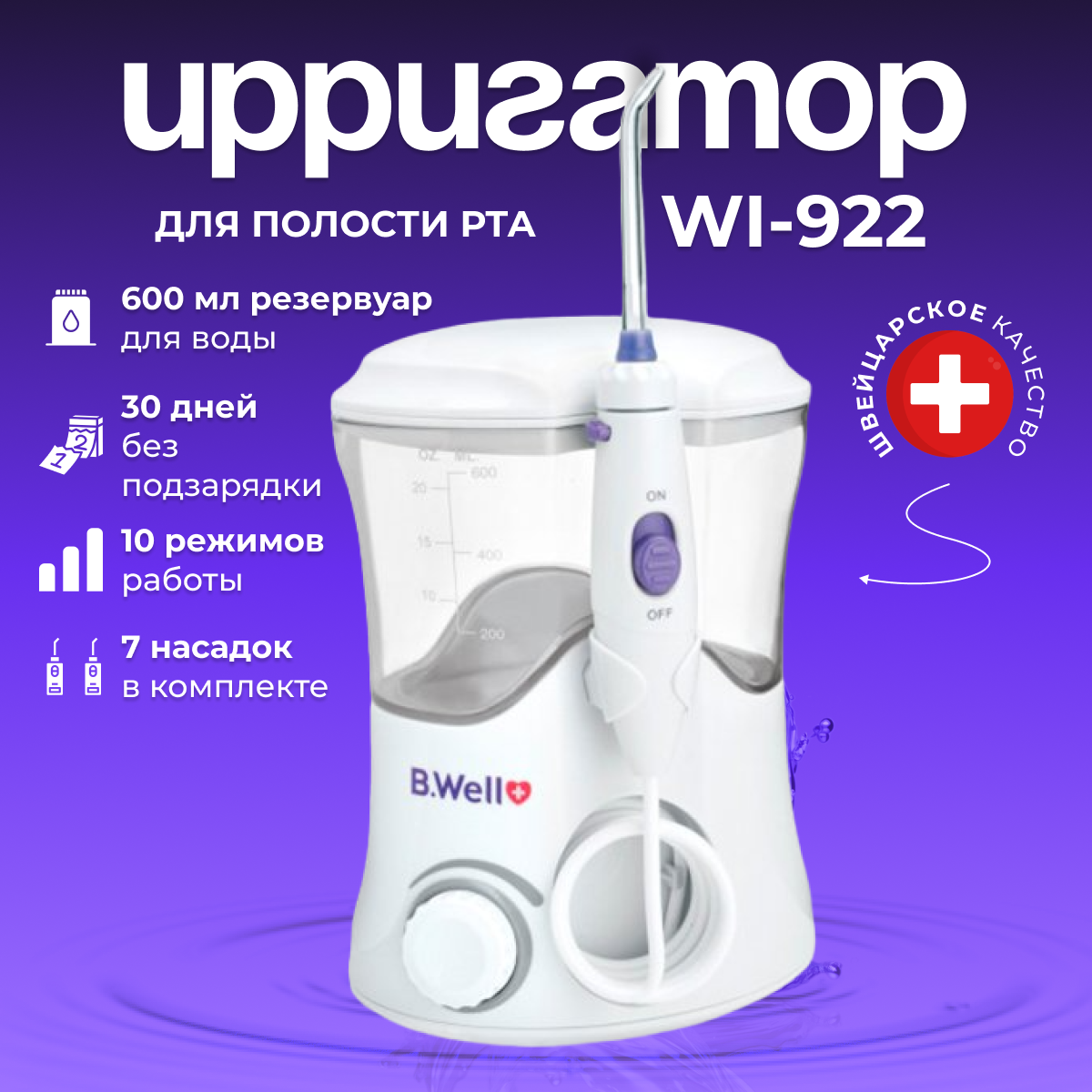 Ирригатор для полости рта модель WI-922 с принадлежностями. Стационарный. Семейный. 7 насадок в комплекте. 10 режимов регулировки мощности интересное: