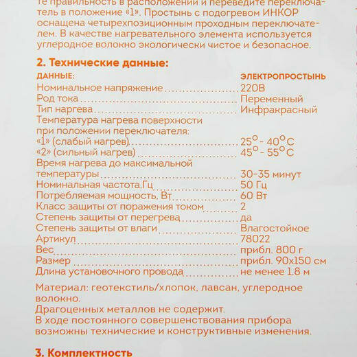 Электропростынь "Инкор", 60 Вт, 90х150 см, 35-45°С, 3 режима, защита от перегрева интересное: