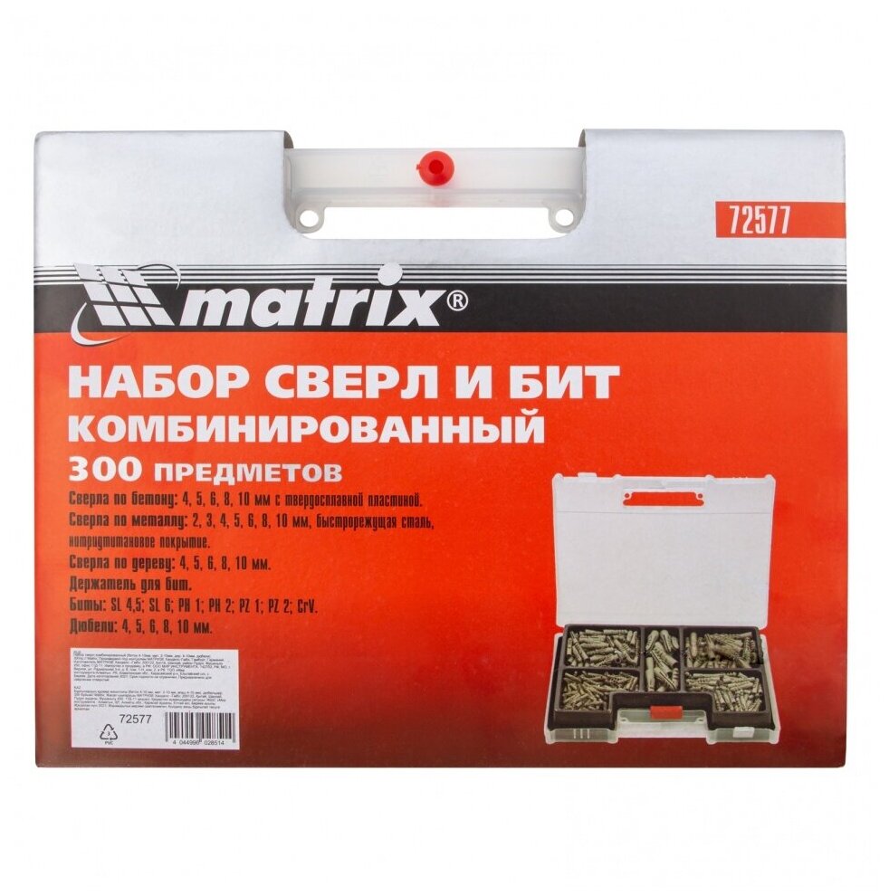 Набор сверл комбинированный (бетон 4-10мм, мет. 2-10мм, дер. 4-10мм, дюбеля) 300пр., MATRIX 72577