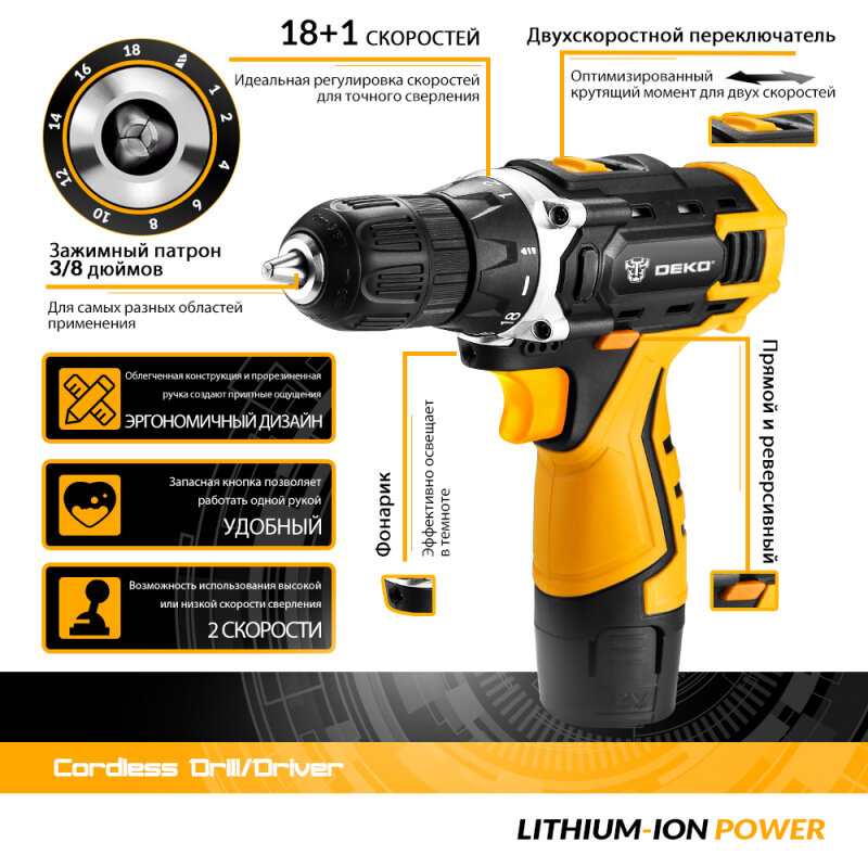 Дрель-шуруповерт аккумуляторная DEKO DKCD12FU-Li 2*1.5Ah 12В, набор 193 аксессуара, в кейсе интересное: