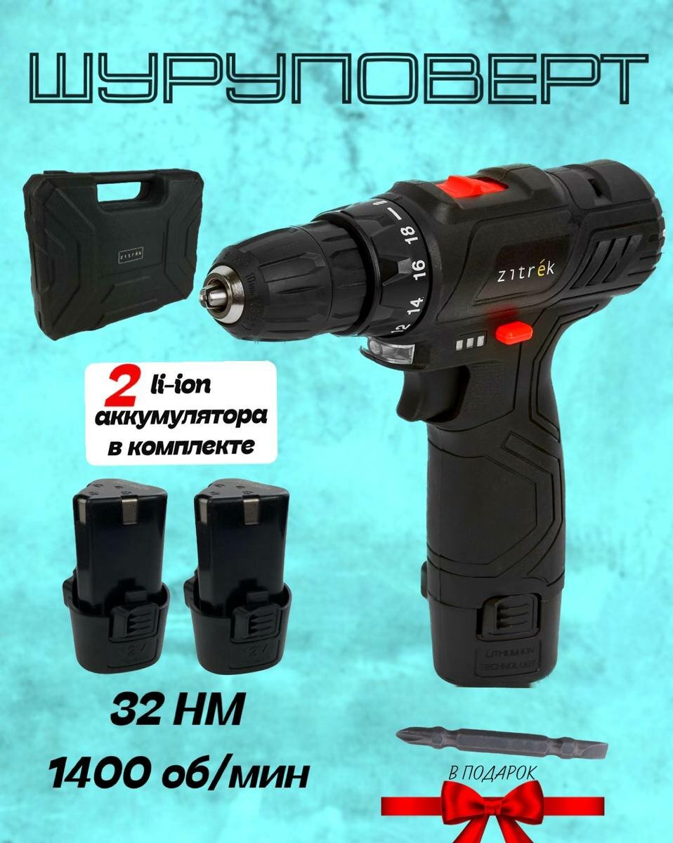 Дрель аккумуляторная Zitrek Crusher 12-Li (12В, Li-ion аккумулятор 2шт, ЗУ, кейс, бита)