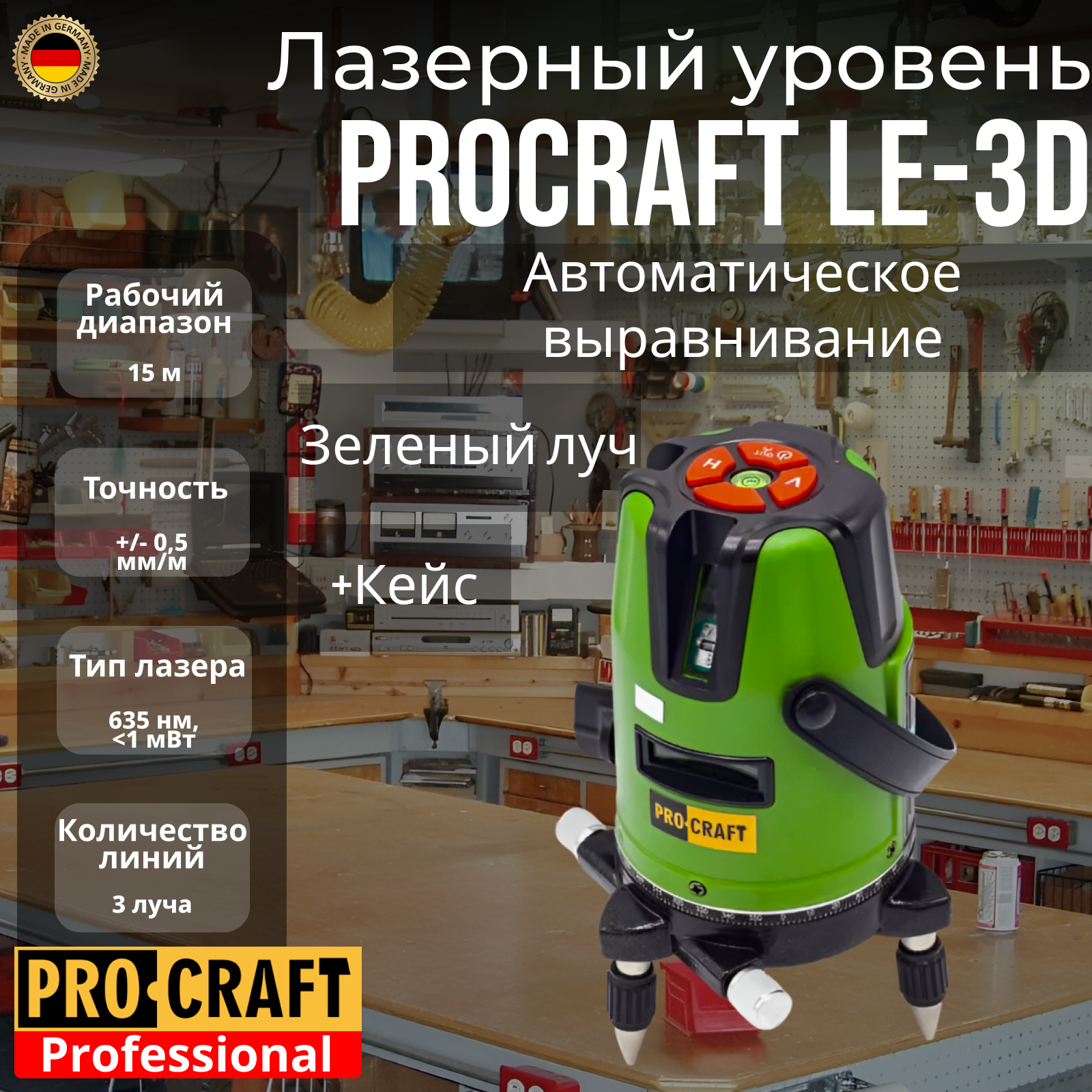 Лазерный уровень, нивелир Pro-Craft Professional LE-3D, 3 линии луча, +/-0,5мм/м, дальность 15м