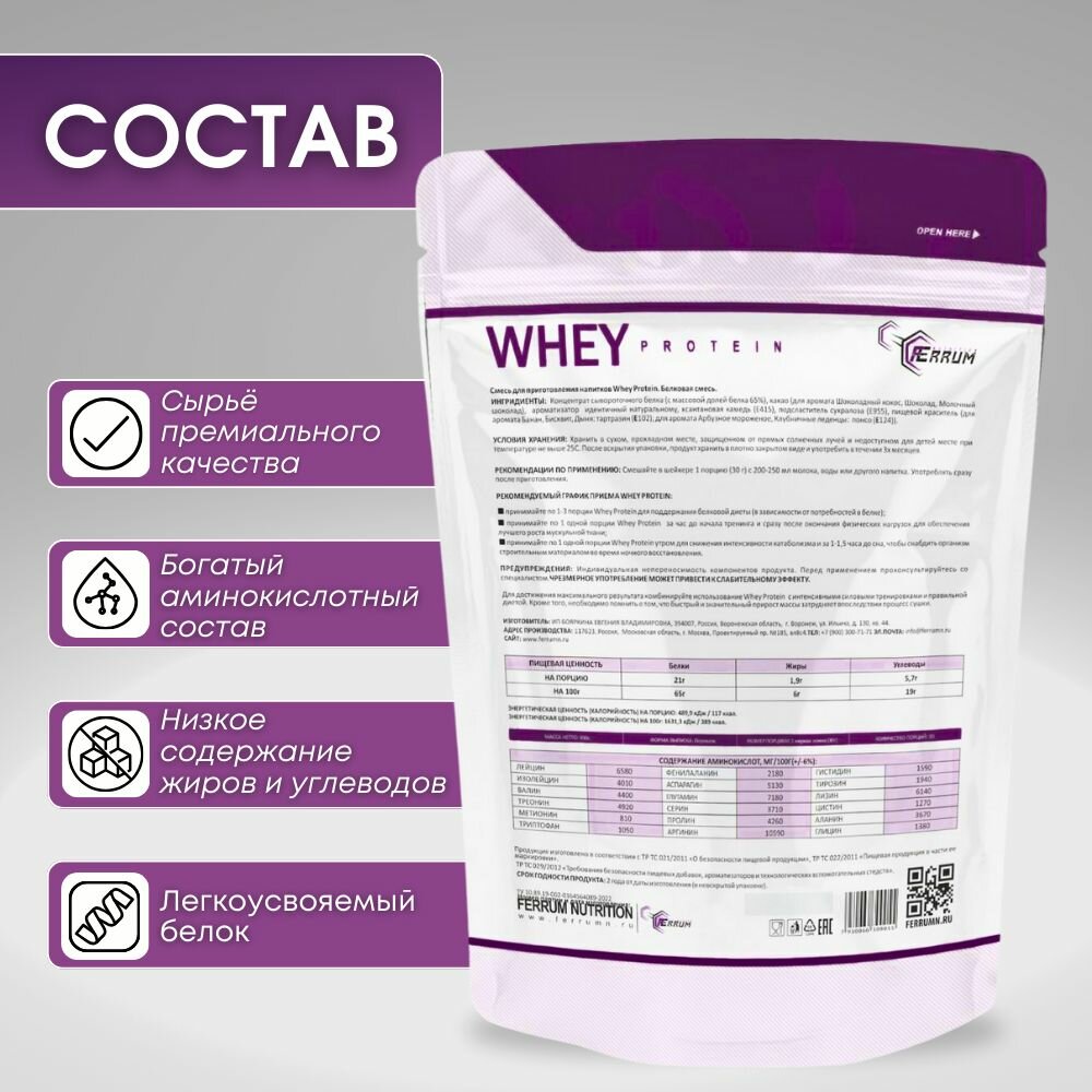 Купить Протеин Whey Protein от Ferrum Nutrition/ Сывороточный протеин / Протеиновый коктейль для похудения / вкус: шоколад. 900 грамм, 30 порций.