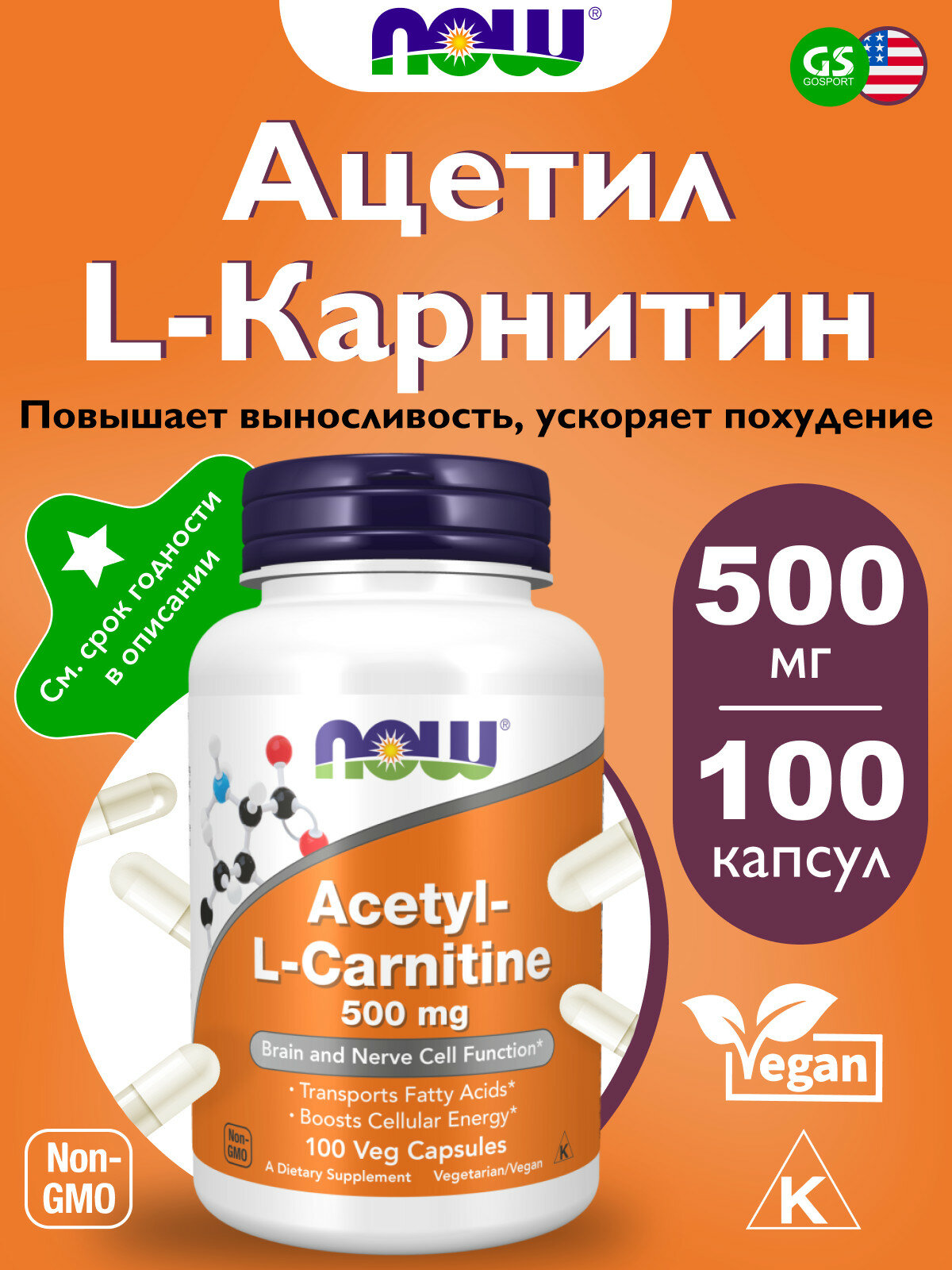NOW ACETYL-L-CARNITINE 500 мг (100 вег.капс)