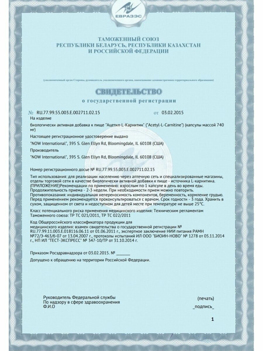 NOW Acetyl l-carnitine 500 мг (50 капс.)