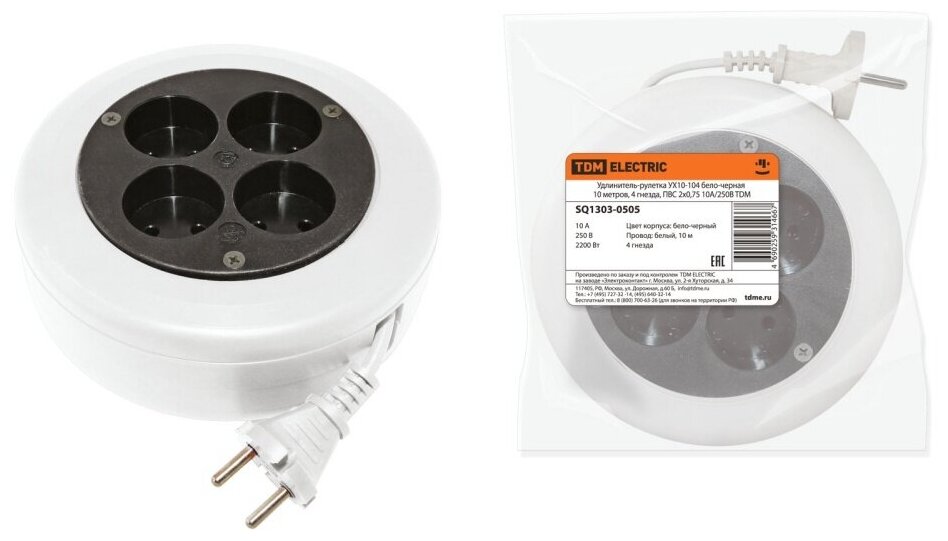 Удлинитель-рулетка УХ10-104 бело-черная 10 метров, 4 гнезда, ПВС 2х0,75 10А/250В TDM SQ1303-0505 интересное: