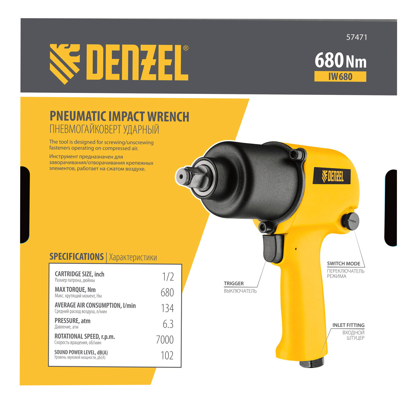 Ударный пневмогайковерт IW680, 1/2, 7000 об/мин, 680 Нм Denzel Denzel 57471