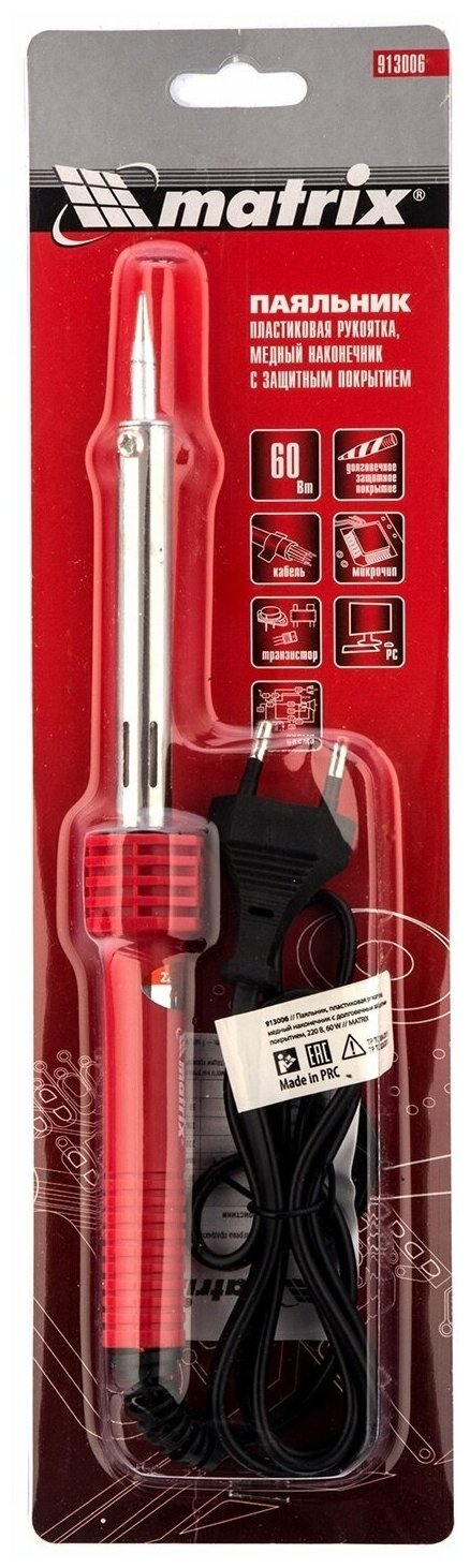Паяльник, пластиковая рукоятка,медный наконечник с долговечным защитным покрытием, 60W// Matrix 9130 .