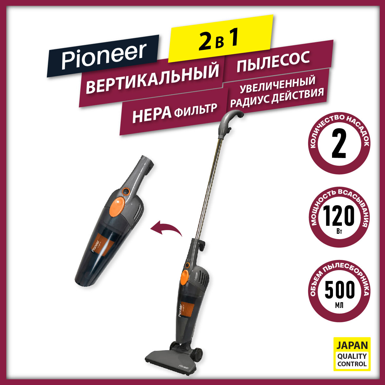 Вертикальный пылесос Pioneer 2 в 1, 2 насадки, моющийся HEPA фильтр, 120 Вт