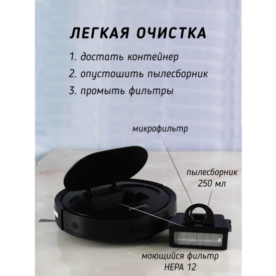 Робот-пылесос Pioneer VC701R, black 2 в 1, 4 режима уборки, моющийся фильтр HEPA12, пульт ДУ