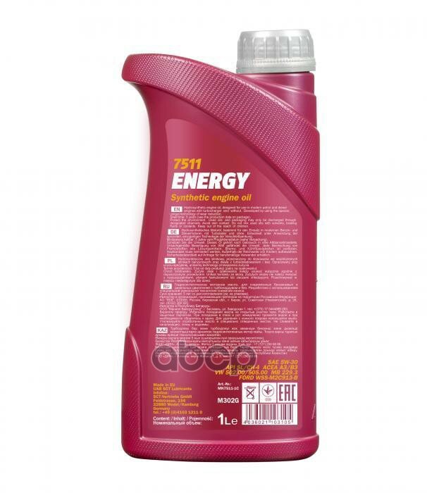 Масло Mannol Energy 5W30 синт. 7511 (1 л) API SN, ACEA A3/B4, FORD WSS-M2C913-B; VW 502.00/505.00; MB 229.3