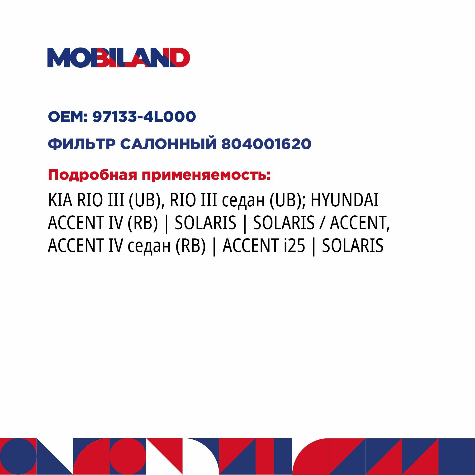 Фильтр Салонный Kia Rio Iii (Ub), Hyundai Solaris (Rb) Mobiland 804001620 MOBILAND арт. 804001620