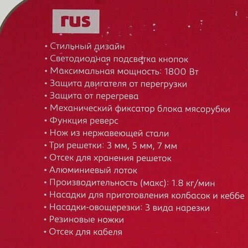 | Дополнительная информация | 3 решетки, гарантийный талон., камера овощерезки с толкателем и 3 конусами-терками, комплектация: мясорубка, насадки для колбасок и кеббе (поставляются внутри толкателя), пластиковый лоток, руководство пользователя |