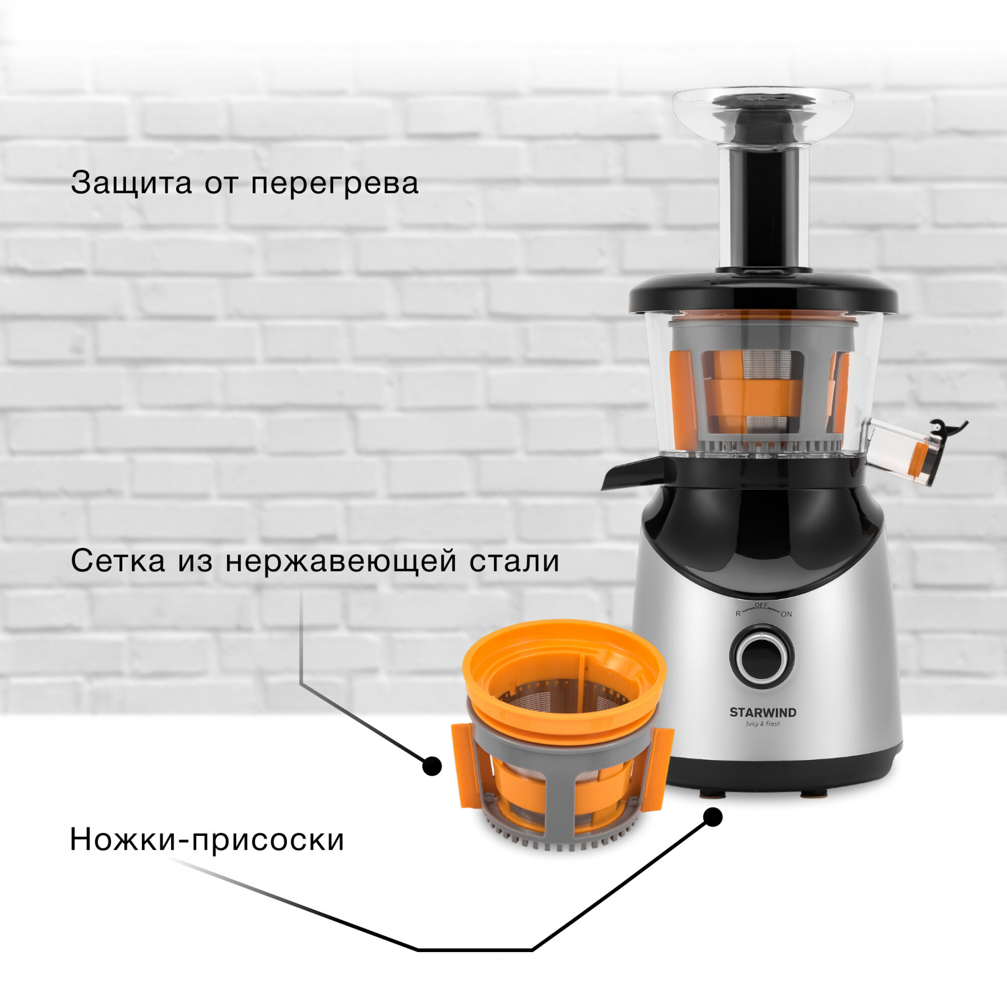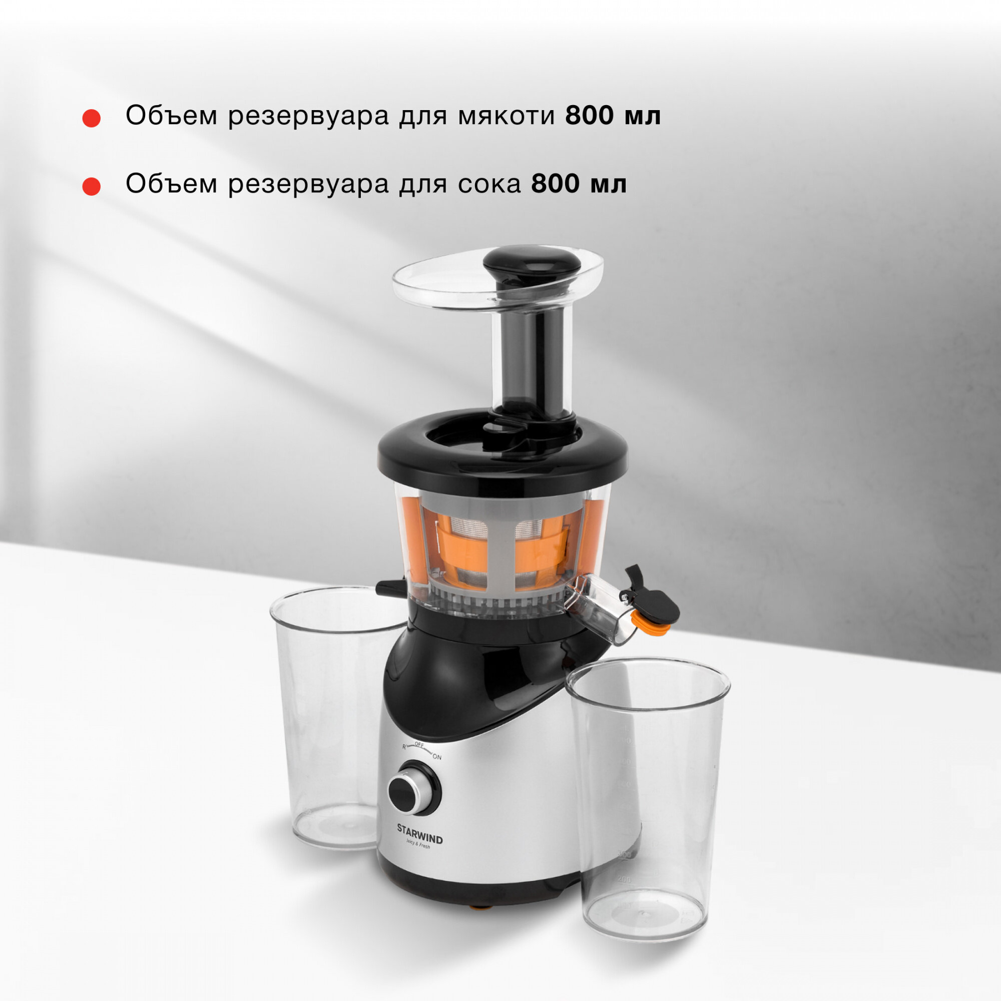 2. Устойчивая благодаря прорезиненным ножкам. 3. Большие емкости для сбора сока и жмыха. |
