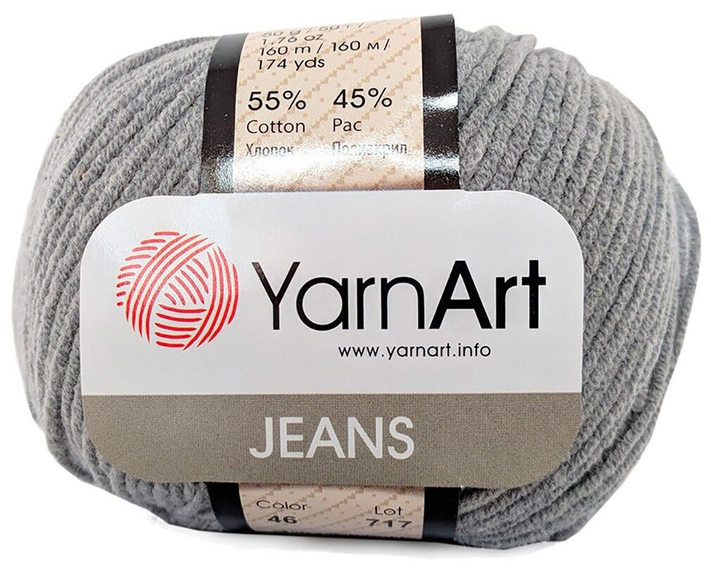 Пряжа YarnArt Jeans, цвет серый 46, 5 мотков, 50г/160м, состав 45% акрил, 55% хлопок, ярнарт джинс