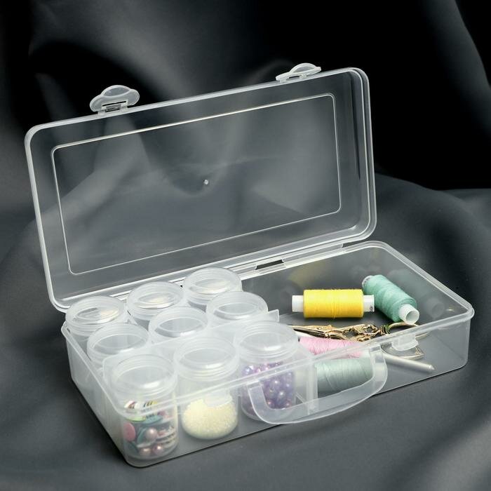 Арт Узор Контейнер для рукоделия, со съёмными ячейками, 5 отделения, 26 × 13 × 6,5 см, 9 баночек, d = 4 × 6 см, 20 гр, цвет прозрачный интересное: