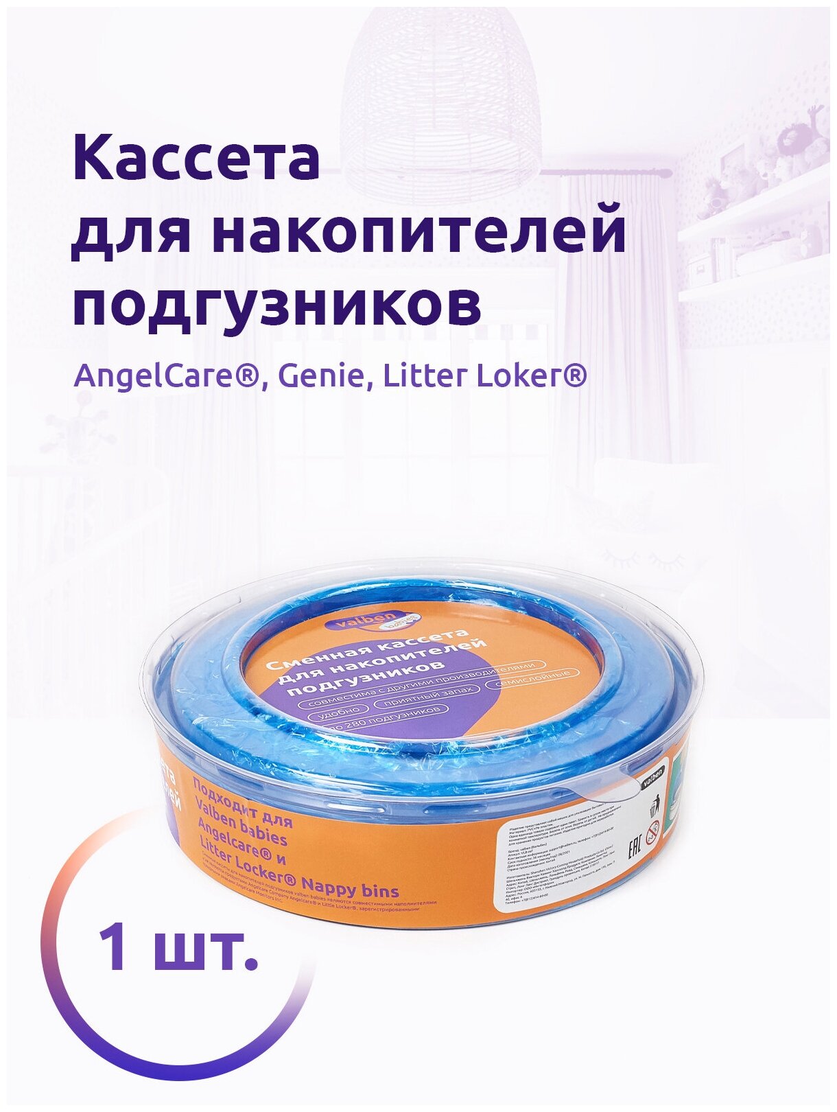 Сменная кассета для накопителя подгузников AngelCare, Genie и др, Valben Babies, 1шт, 7,5 м, голубой, ароматизатор - ваниль интересное: