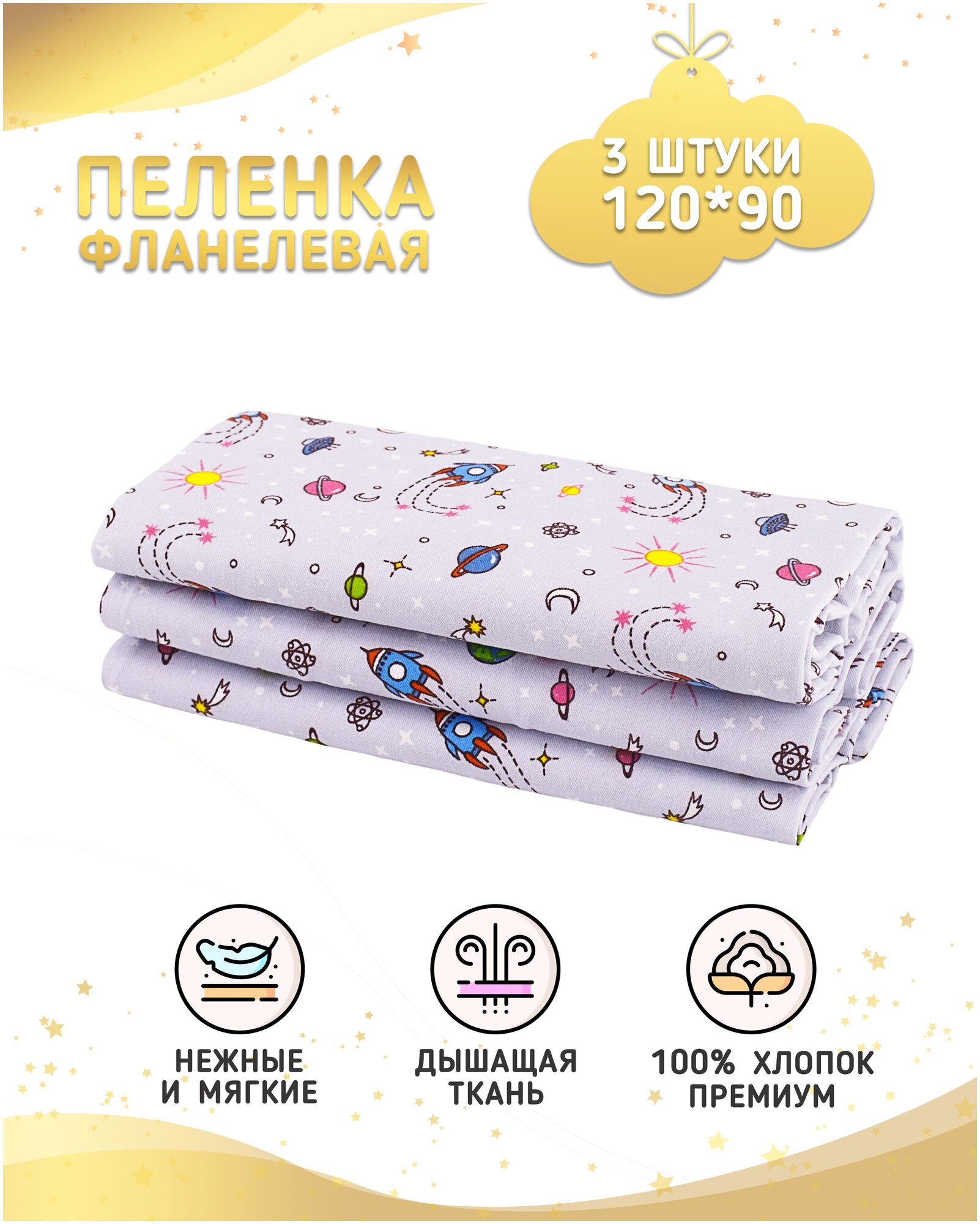 СохранитьПро Сон Пеленка фланелевая, 3 шт. в упаковке, космос интересное: