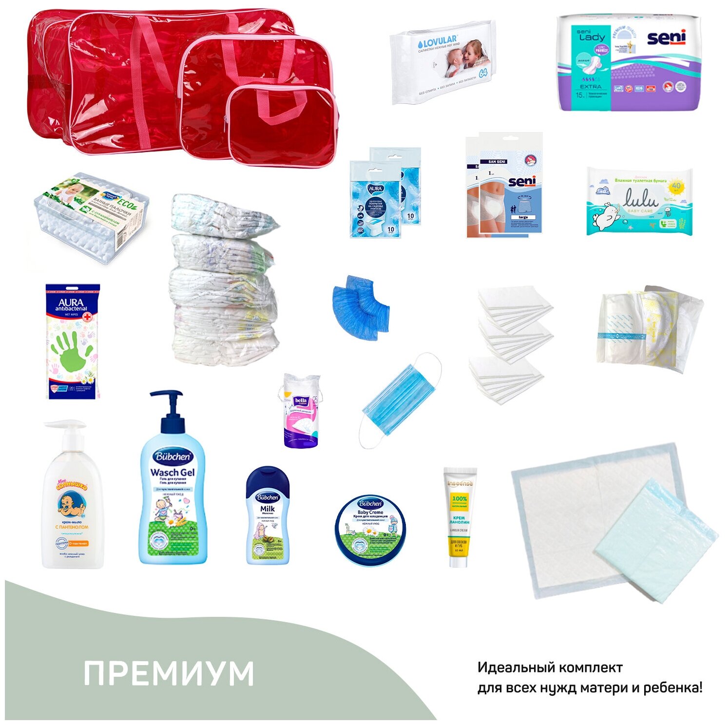 Купить Сумка в роддом для мамы и малыша готовая с наполнением, 26 предметов + 3 сумки, комплектация "Премиум", красная