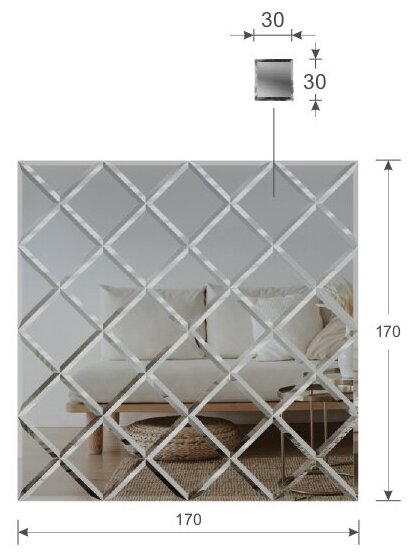 Зеркальное панно 170х170 см., зеркальная плитка квадрат 30x30 см., цвет графит. "ДСТ" интересное: