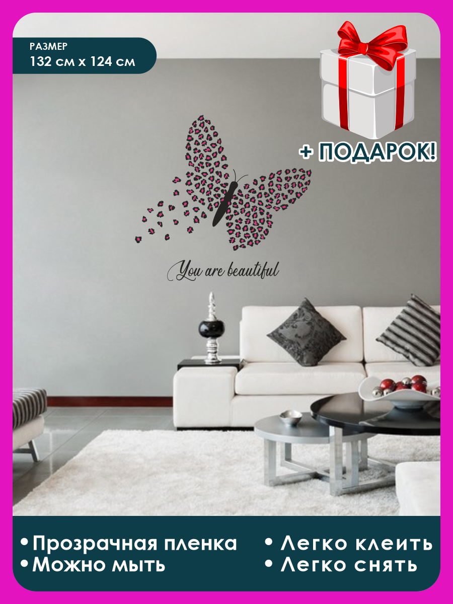 Наклейка интерьерная для декора на стену бабочка чёрно-розовая 132х124 см интересное: