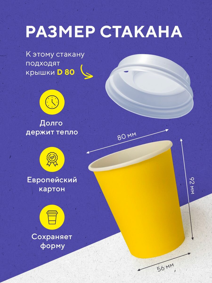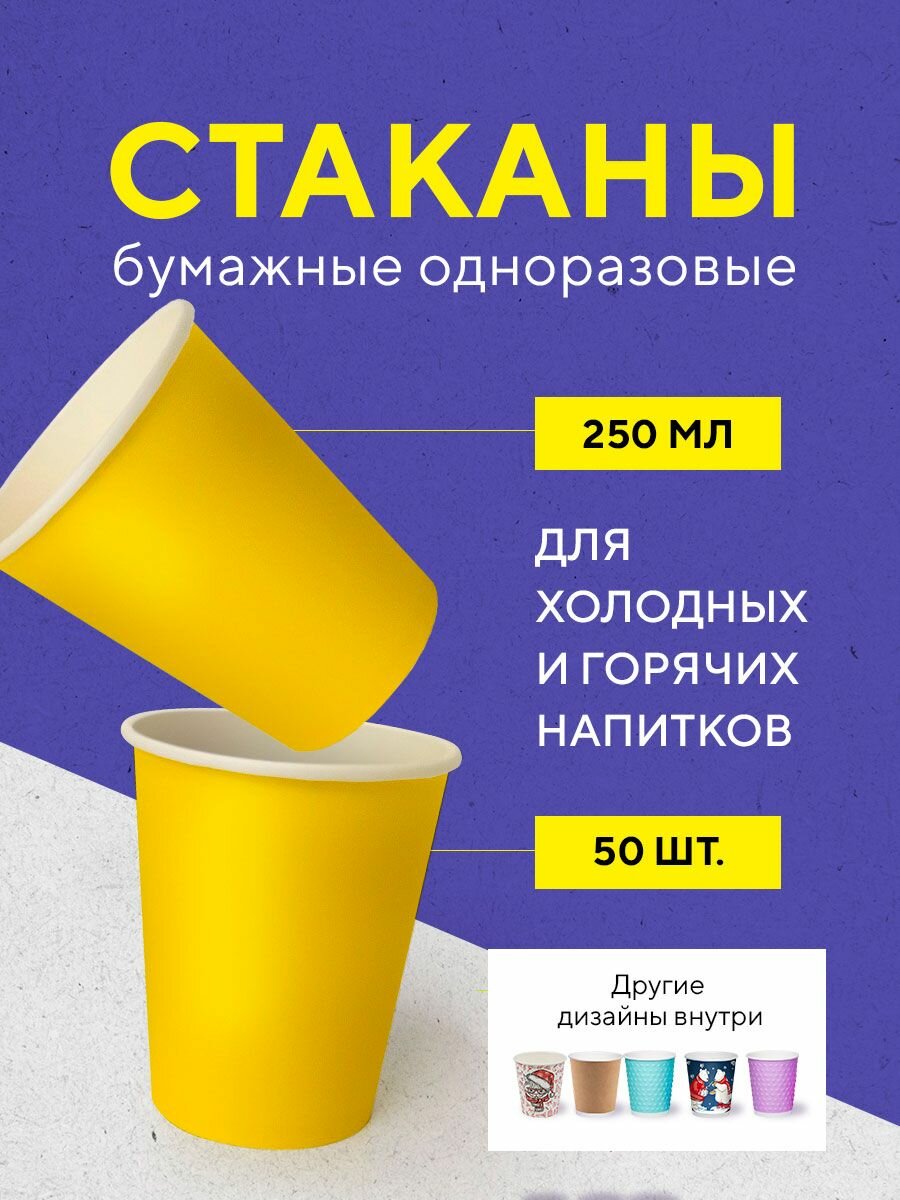 Бумажные одноразовые стаканы, 250 мл, жёлтые, однослойные, для кофе, чая, холодных и горячих напитков, 50 шт в упаковке