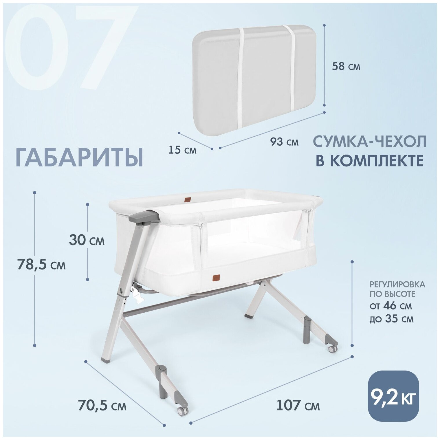 | Комплектация | матрас полиуретановый / простыня на резинке / чехол для переноски / ремень для фиксации с родительской кроватью |