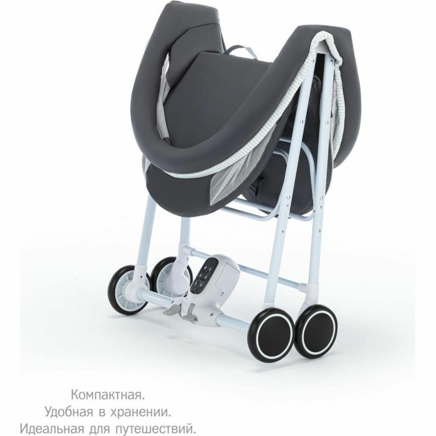 | Плюсы: | легко складывается и не занимает много места, сама укачивает малыша в любом из пяти режимов скорости, комфортный и качественный материал, идеален для самых маленьких |