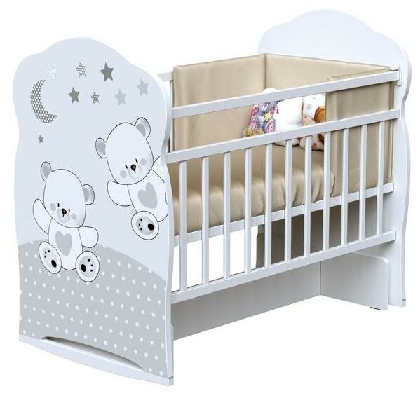 Кроватка детская для новорожденных ВДК Funny Bears, колесо-качалка, массив березы, белый