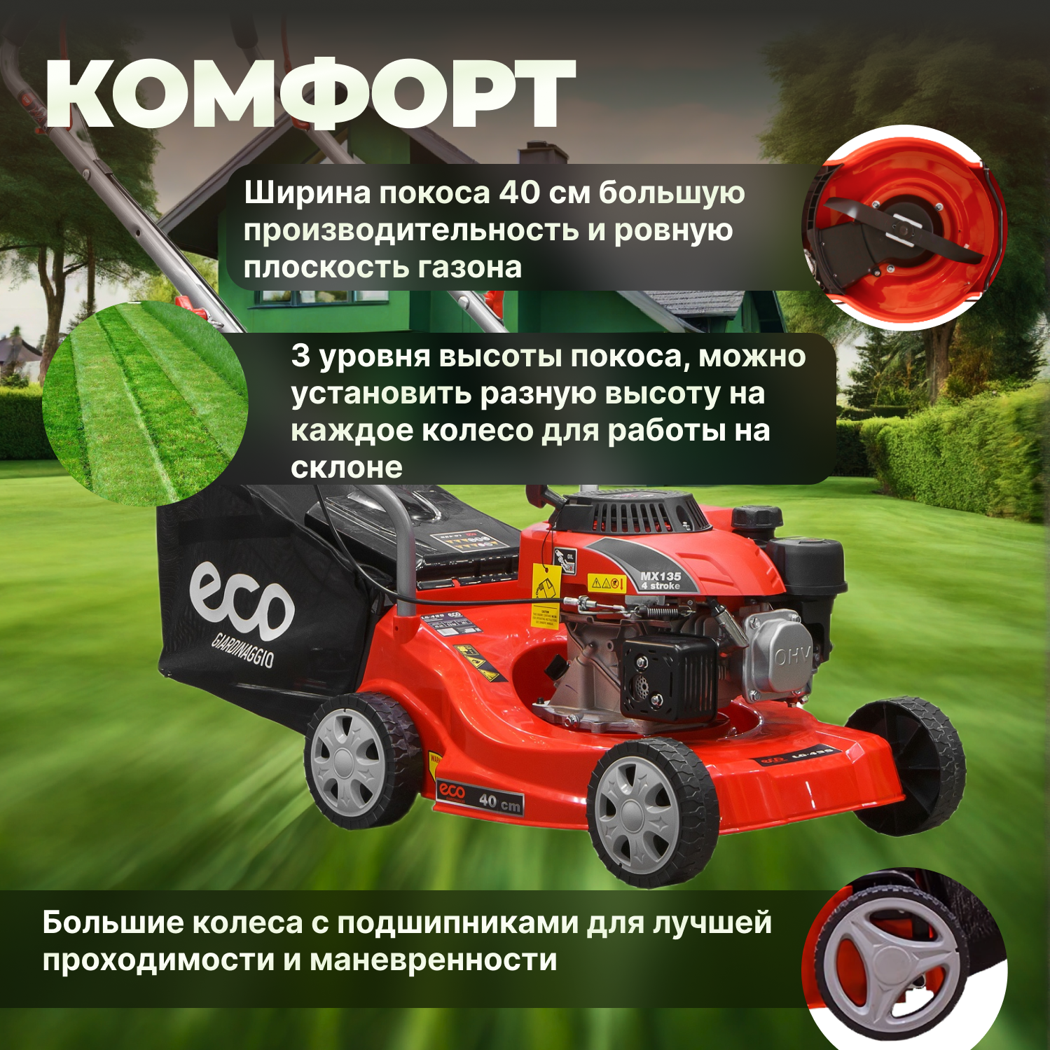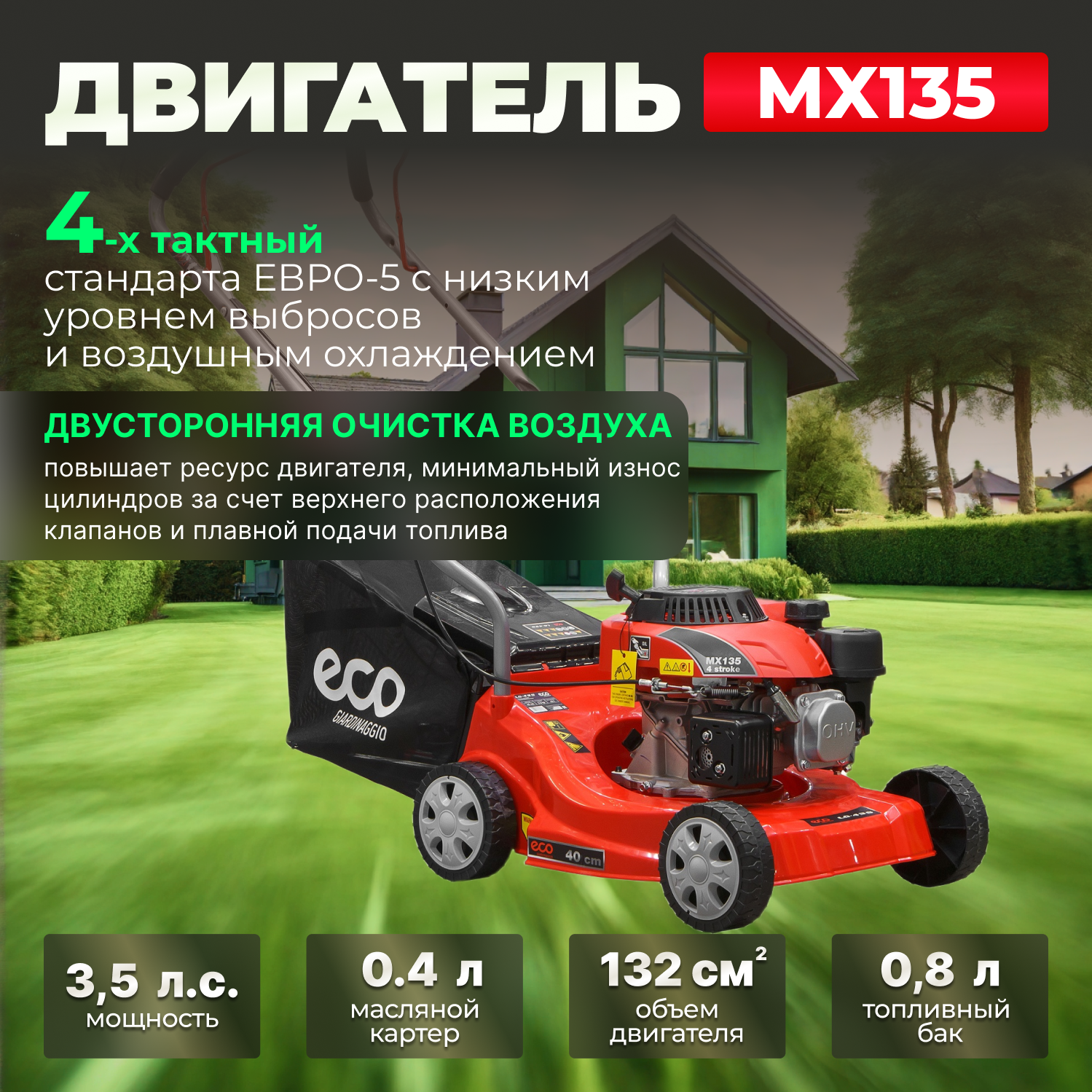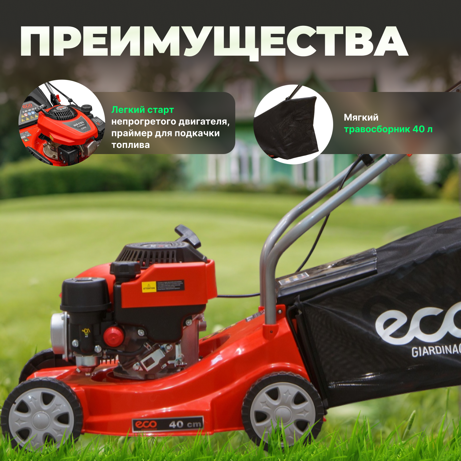 Газонокосилка бензиновая ECO LG-435 (3.5 л.с., шир. 40 см, ручной привод, пластик. корпус, травосборник 40 л)