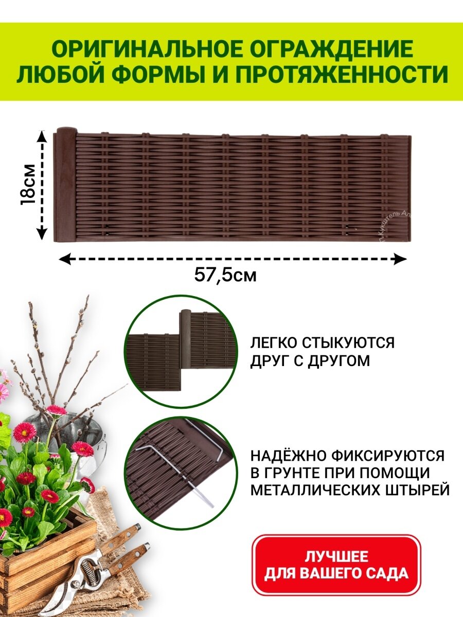 Забор декоративный МастерСад Лоза коричневый 2,3 метра / бордюр для сада и огорода / Ограждение садовое для клумб и грядок / забор пластиковый