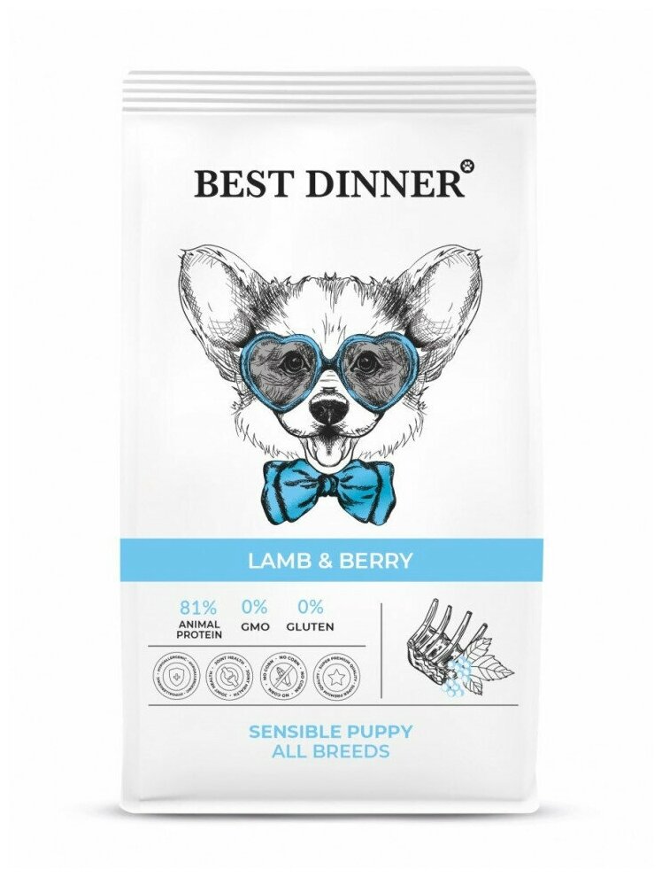 BEST DINNER PUPPY SENSIBLE LAMB & BERRY для щенков всех пород, беременных и кормящих сук с чувствительным пищеварением с ягненком и ягодами (1,5 кг)
