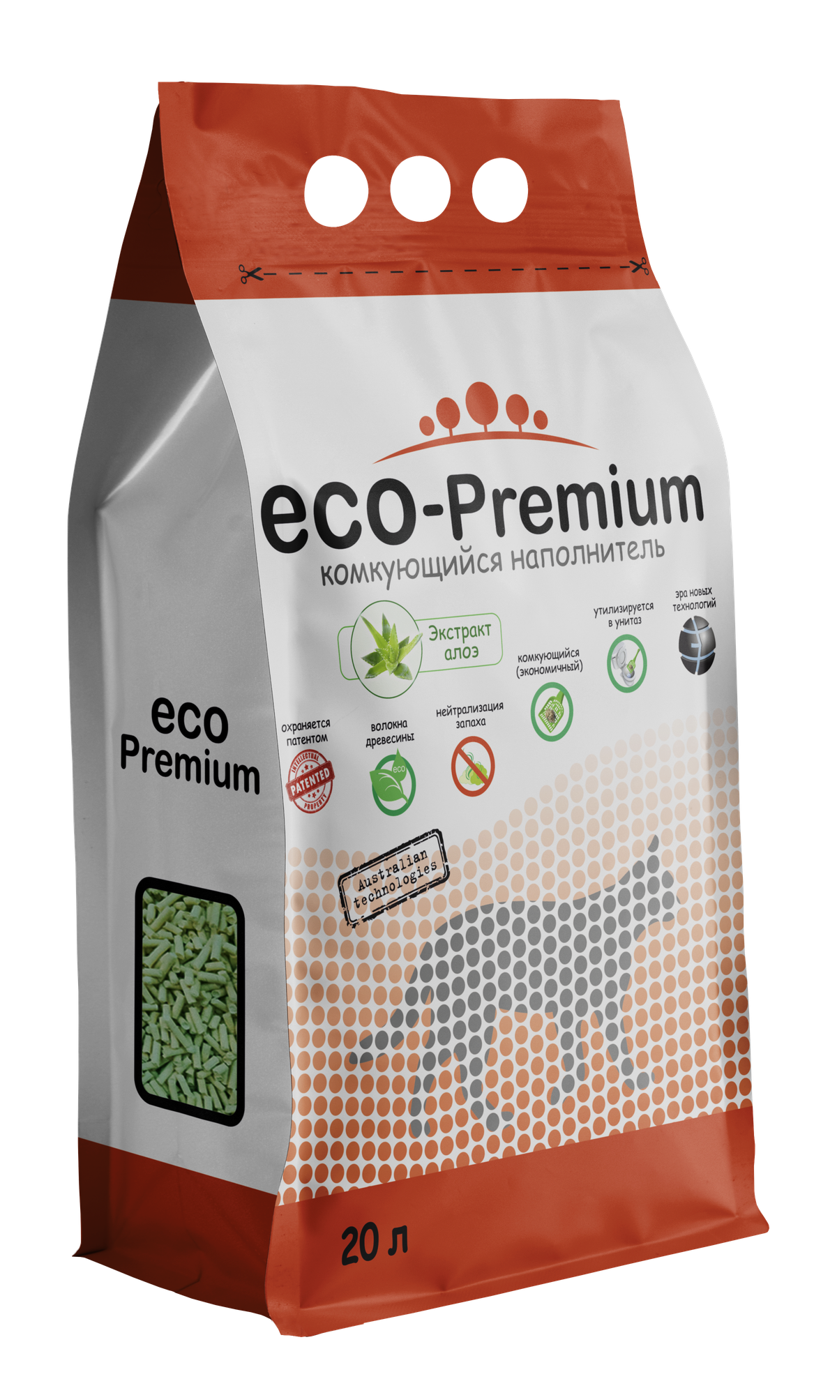 Наполнитель ECO-Premium комкующийся древесный с Зелеными гранулами, без запаха 20л, 7.6 кг
