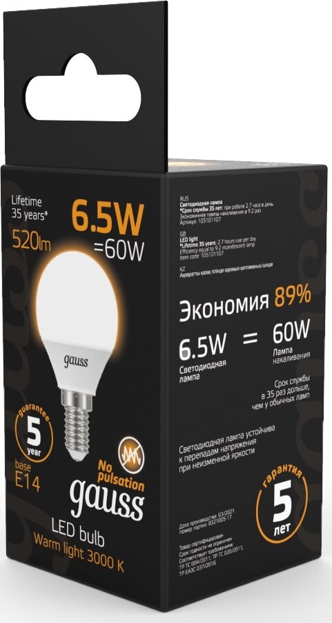 Светодиодная лампа Gauss LED Globe E14 6.5W 100-240V 3000K (упаковка 10 шт) интересное:
