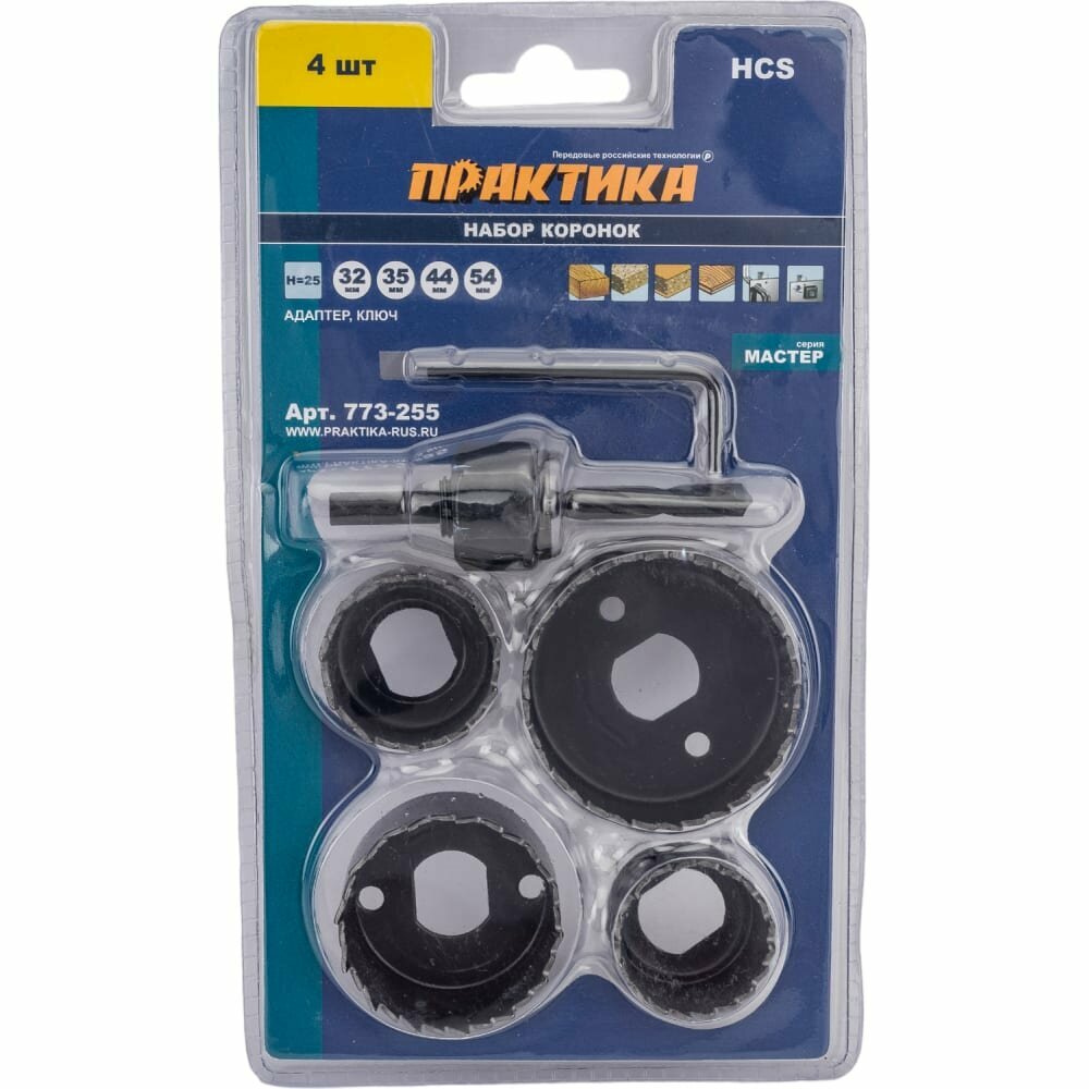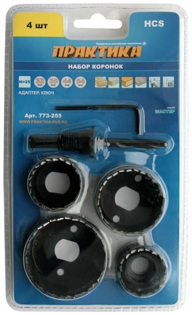 Набор HCS коронок 4 шт 32, 35, 44, 54 мм + адаптер ПРАКТИКА 773-255